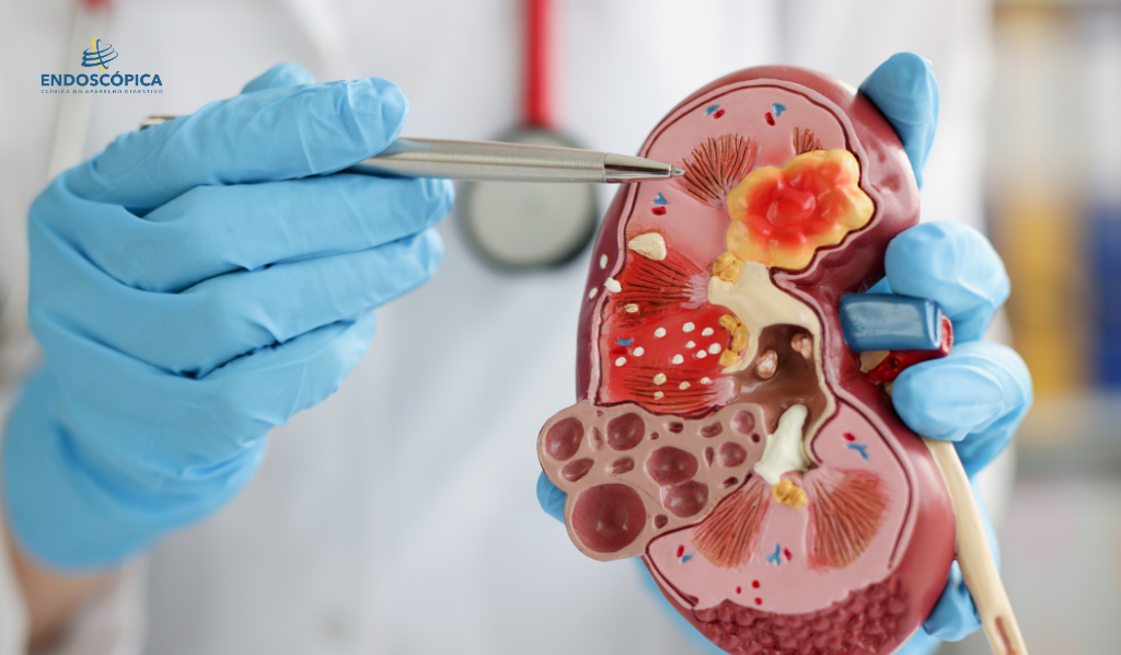 A grande característica é que muitas vezes as crises renais passam despercebidas, sem sintomas, e outras vezes vêm com uma dor forte que começa nas costas e se irradia para o abdômen em direção à região inguinal.